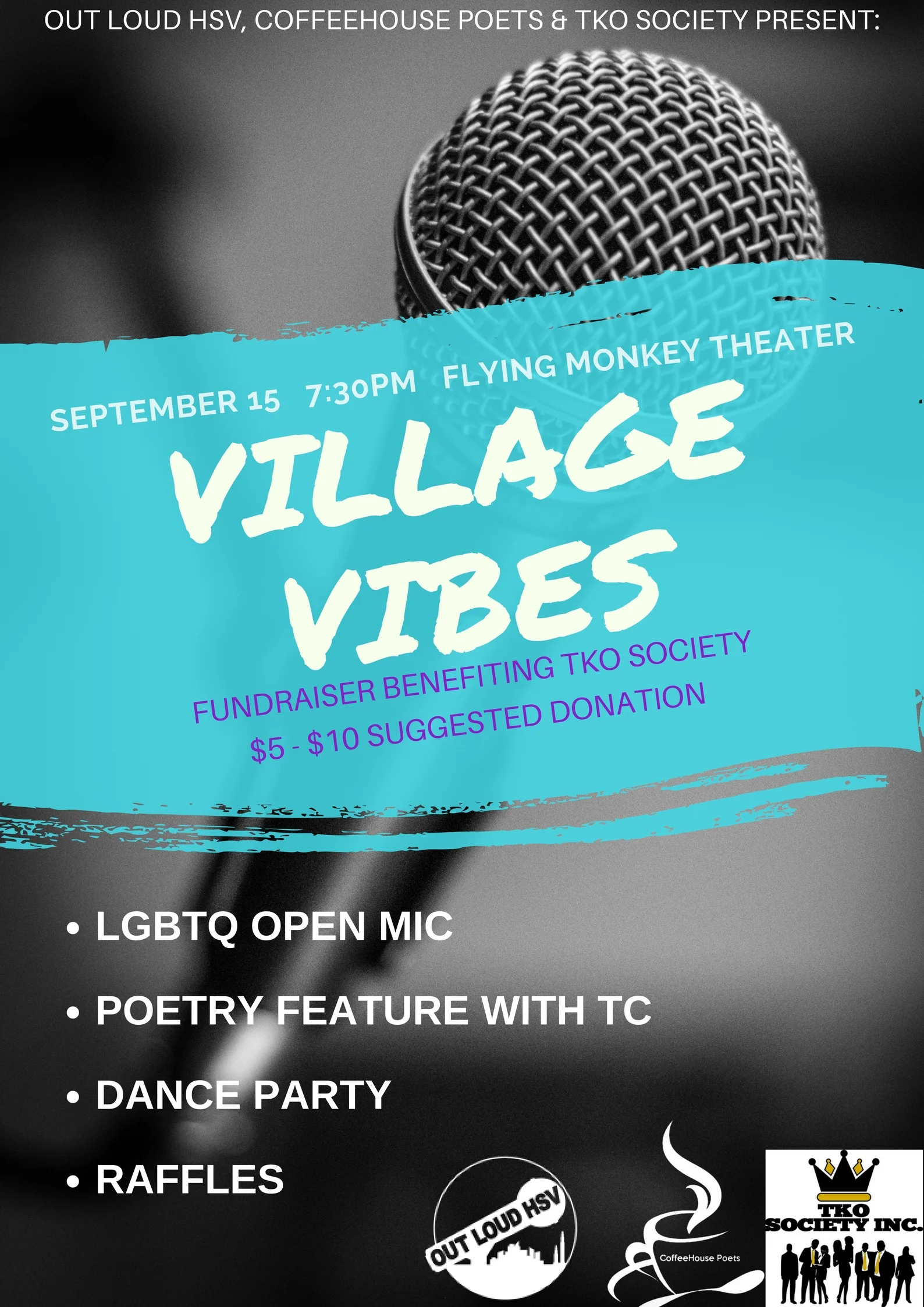 Out Loud HSV, Coffeehouse Poets, and The Knights & Orchids Inc. - TKOare coming together to bring you Village Vibes on September 15 in theFlying Monkey Arts Theater. Enjoy an LGBTQ open mic, a poetry feature with Traniesa TC Caldwell, raffles, and a dance party! The LGBTQ open mic kicks off at 8pm, so arrive before then if you wish to sign up!